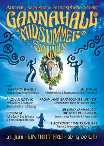 Am längsten Tag des Jahres erwartet euch ein Musikerlebnis der besonderen Art: Zum Anfassen, zum Mitmachen, zum Träumen und zum Staunen. In der mystischen Umgebung von Gannahall könnt ihr nicht nur Instrumente der Antike bis Renaissance hören, sondern auch selbst ausprobieren. Verschiedene Künstler bieten ein breites Spektrum von epischen Bardenliedern, keltischen Harfenklängen, schamanistischen Trommeln bis hin zu Ancient Trance Beats zu fortgeschrittener Stunde. Weiter unten auf dieser Seite findet ihr das komplette Programm der Konzerte und Workshops.